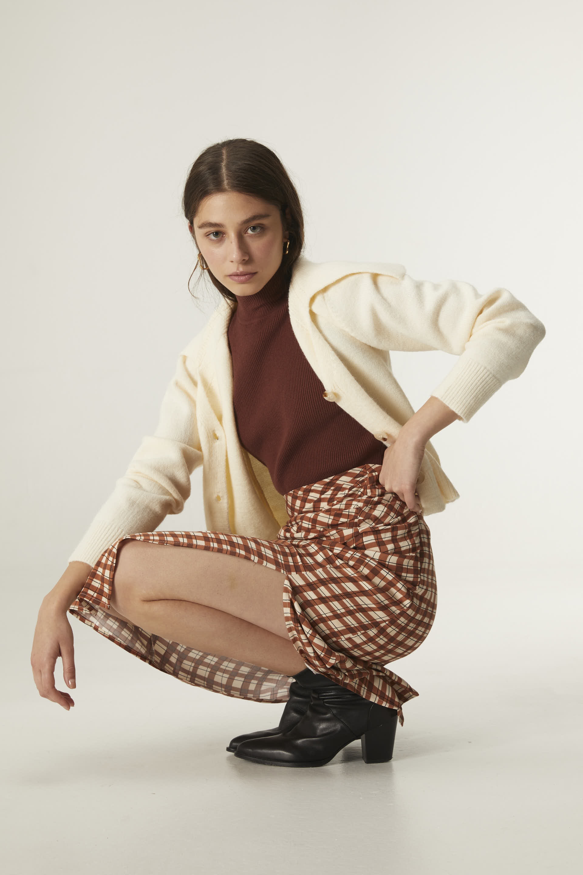 Jupe midi drapée à carreaux. Avec une taille mi-haute fixe. Ouverture frontale. Fermeture à glissière latérale. Le mannequin mesure 173 cm et porte une taille S.