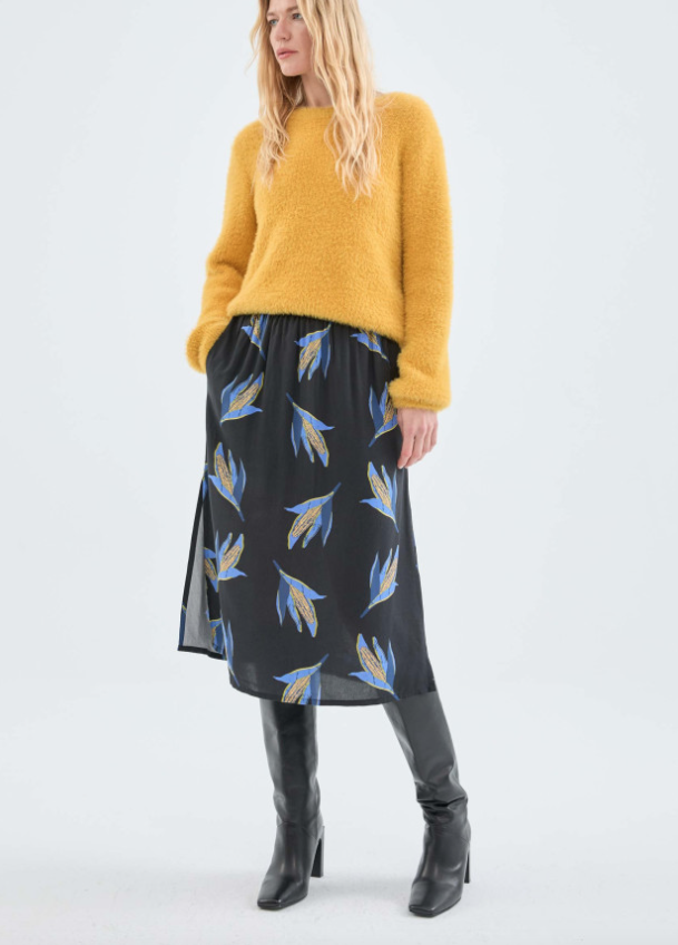 Jupe midi en viscose en LENZING™ ECOVERO™ avec imprimé maïs. Avec une taille élastique de taille moyenne. Poches latérales. Détail des ouvertures sur les côtés. Le mannequin mesure 176 cm et porte une taille S.
