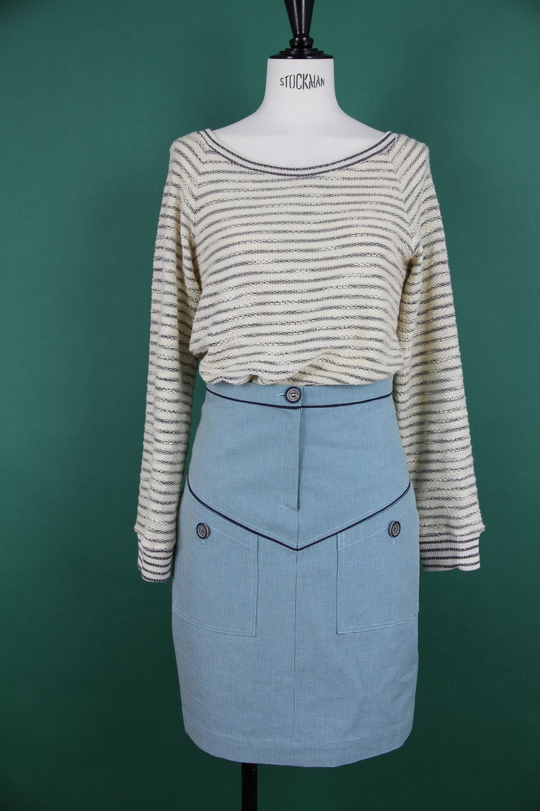 Jupe en toile de coton aux découpes soulignées de passepoil marine. Doublée de voile de coton. Découpe en triangle sur le devant avec deux poches, découpes cow-boy dans le dos. Coloris: rose pâle, vert amande et bleu glacier