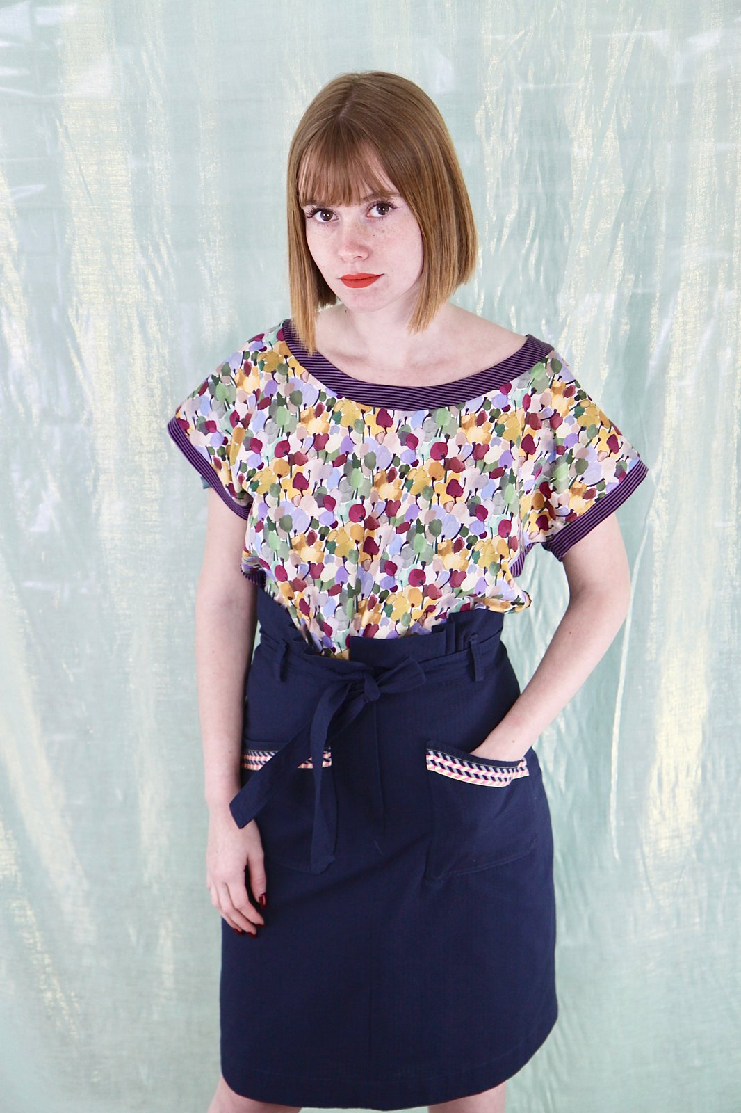 Jupe taille haute. coton type seersucker marine. Doublée de voile de coton. Ceinture en tissu ton sur ton. Poches gansée de ruban tissé. Tissus: possibles : coton type seersucker marine ou lin mélangé (voir pantalon Sam gris). 165€ -50%: 82.5€