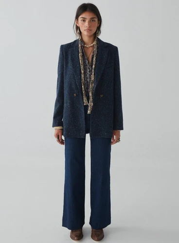 Confectionné en laine viscose à chevrons, le blazer peut être porté avec un jean et un tee-shirt ou avec un look « tout bleu » comme ici avec notre chemisier imprimé Phoebe et notre pantalon Ross.