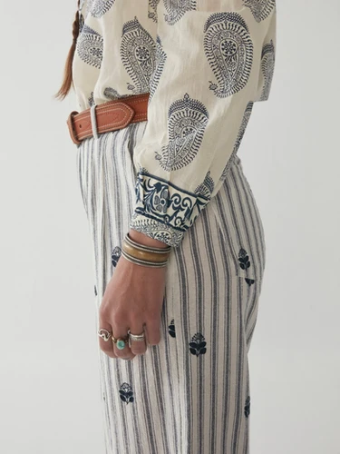 Rendu dans un type spécial et rustique de tissu à rayures en coton, le pantalon Indira facile à ajuster présente une broderie de motifs floraux sur tout le pourtour, ainsi que des poches latérales et arrière.