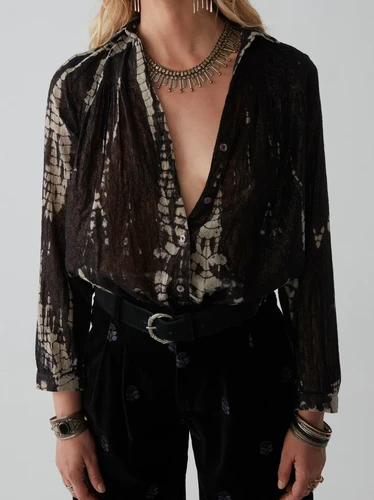 Ce chemisier est doté d’un véritable tie-dye fabriqué au Rajasthan. Le processus artisanal garantit que chaque chemisier est une pièce unique, incarnant l’esprit d’individualité. Fabriqué à partir d’un coton léger et texturé entrelacé de fils métalliques subtils, ce chemisier capture la lumière à chaque mouvement, ajoutant une touche de brillance à sa palette par ailleurs sombre.