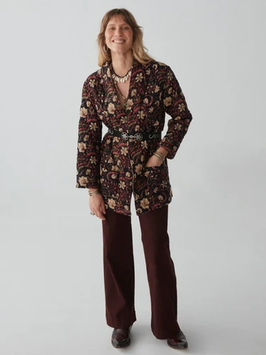 Entrez dans l’hiver enveloppé dans la veste matelassée Theodora, audacieuse et sans complexe. Cette pièce marie des motifs floraux d’inspiration vintage avec une touche bohème et robuste. La riche tapisserie de couleurs – bordeaux profond, olive et ivoire sur fond noir.