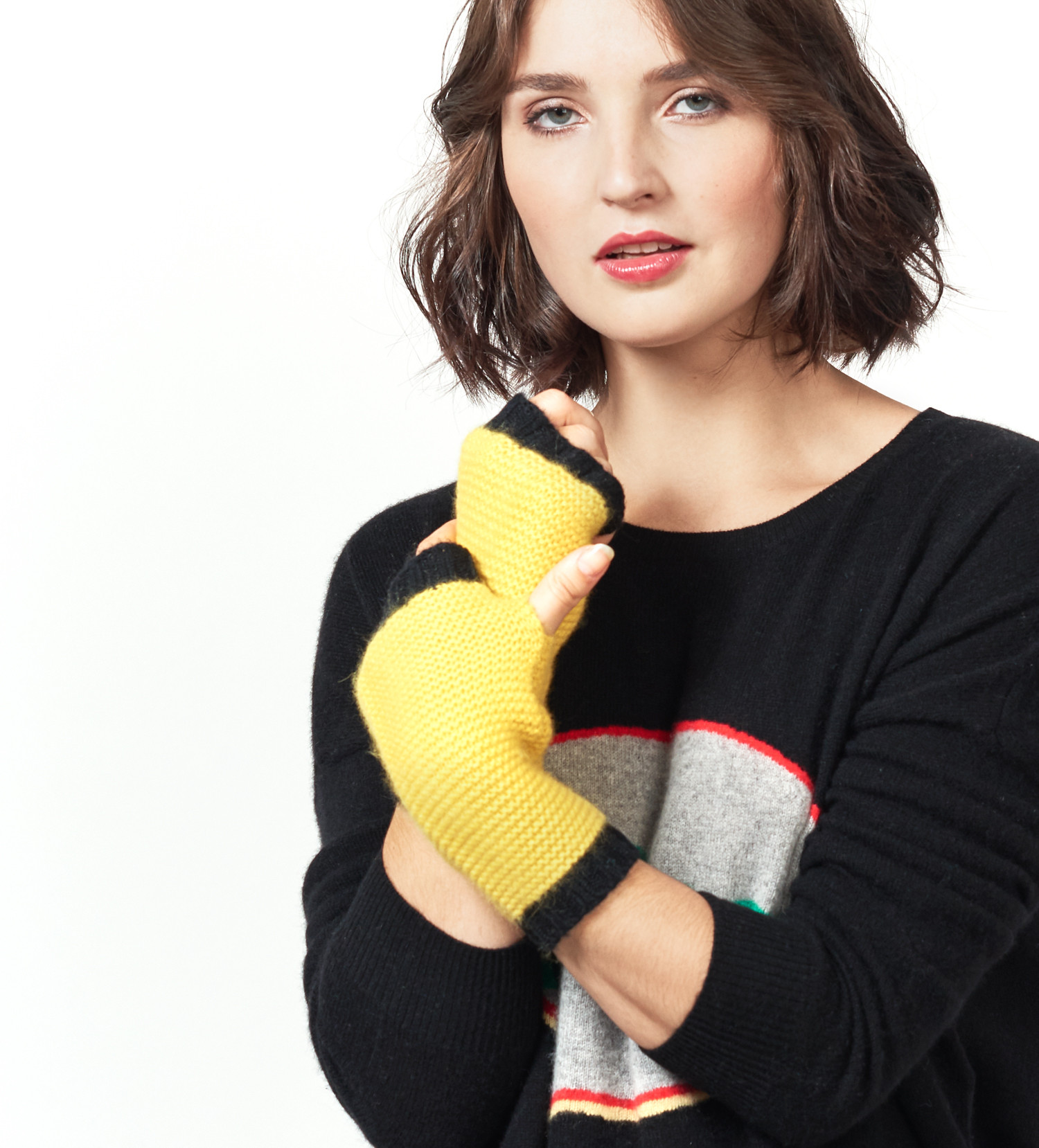 SIENNA :Mitaines point mousse – Longueur : 21 cm100% cachemire – Coloris : Jaune avec une bande Noire.La livraison est offerte pour la France Métropolitaine !