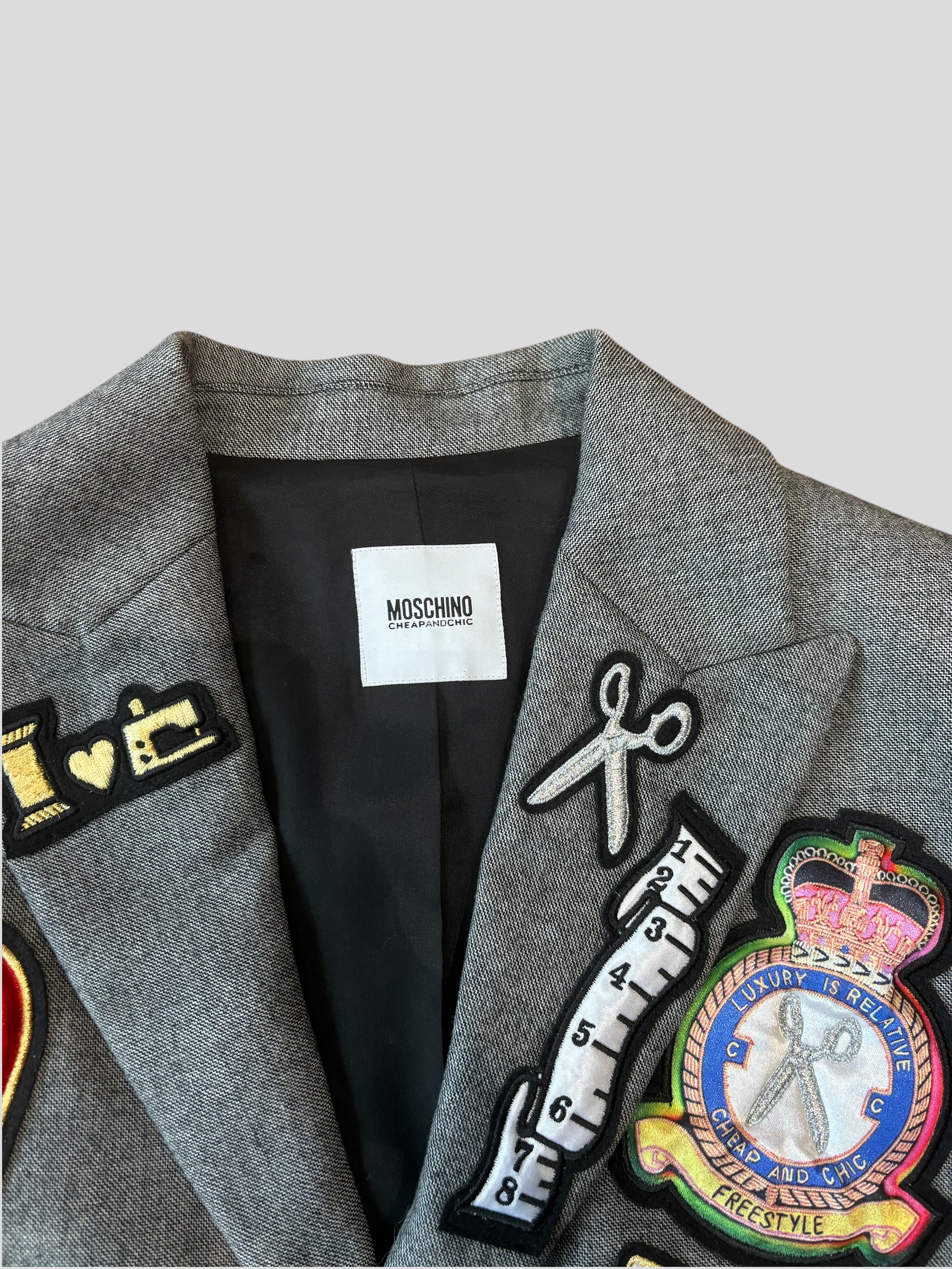 Moschino grey blazer with “couture” patches on the front of the jacket and one on the right sleeves.