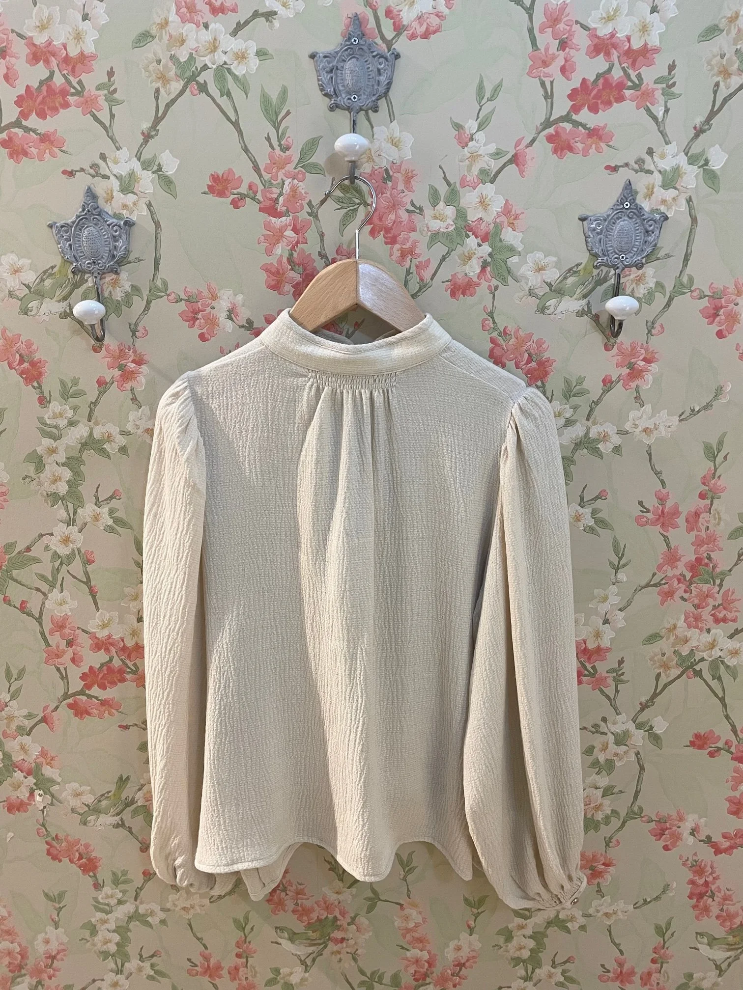 Blouse en coton coupe ample, manches longues bouffantes et poignets resserrés, emmanchure large, encolure arrondie boutonnée et plissée.