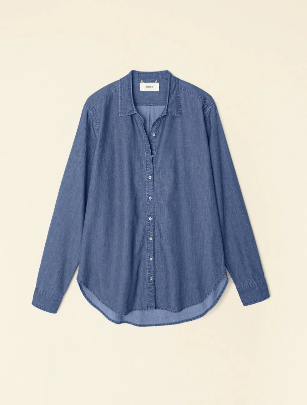 Chemise en coton denim souple, coupe ample et droite, manches longues et poignets resserrés, douce et agréable.