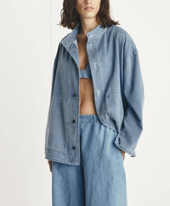 Veste en jean boutonnée, coupe ample, manches longues et poignets légèrement resserrés, emmanchure large. Deux poches plaquées devant, col Mao. Le modèle taille grand.