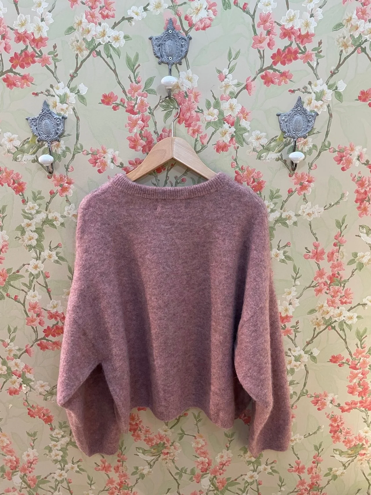 Pull en laine coupe ample, encolure arrondie, manches longues évasées, emmanchure large. Doux et chaud.