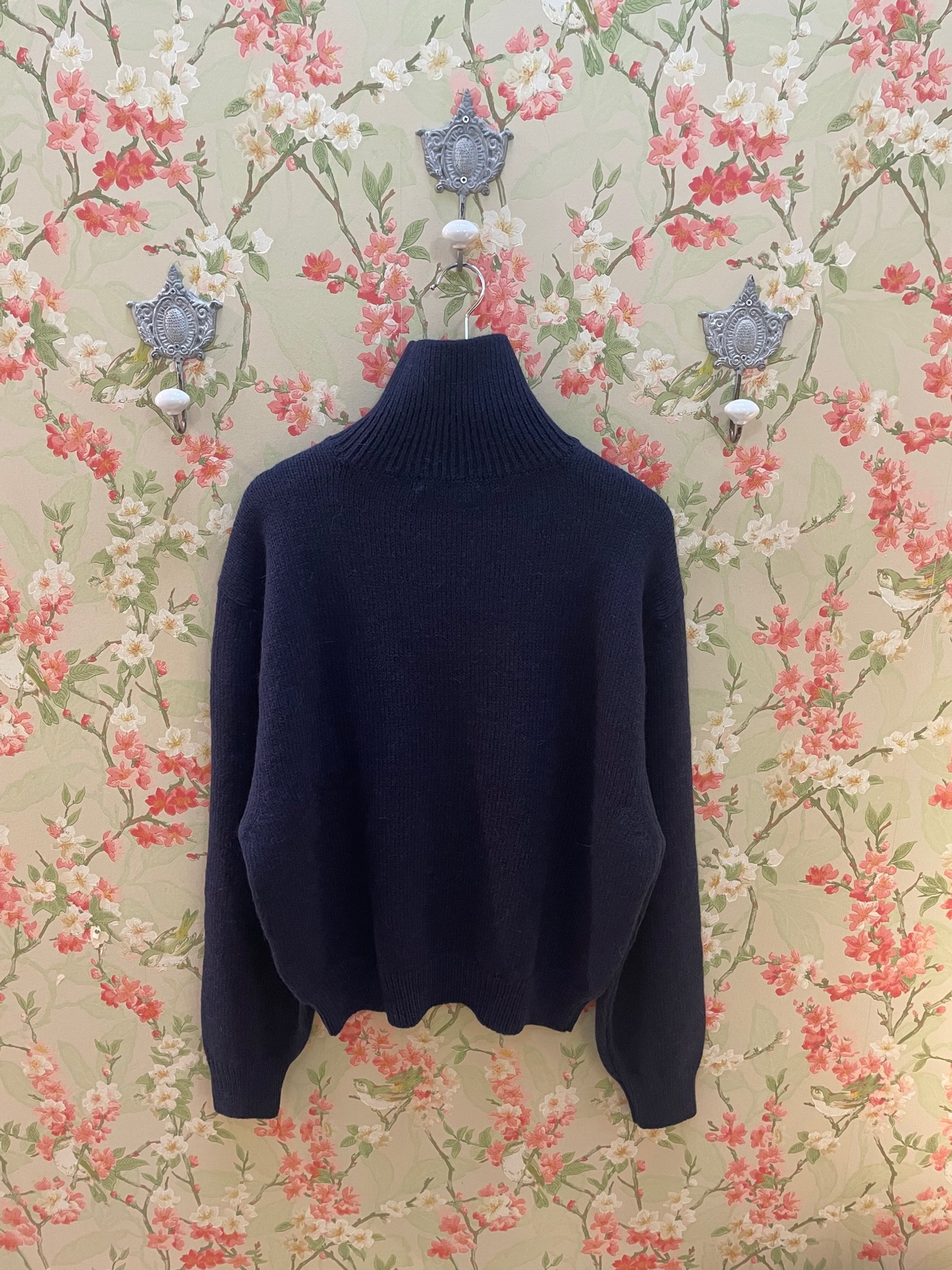 Pull en laine coupe ample, col roulé, manches longues et poignets resserrés, emmanchure large.
