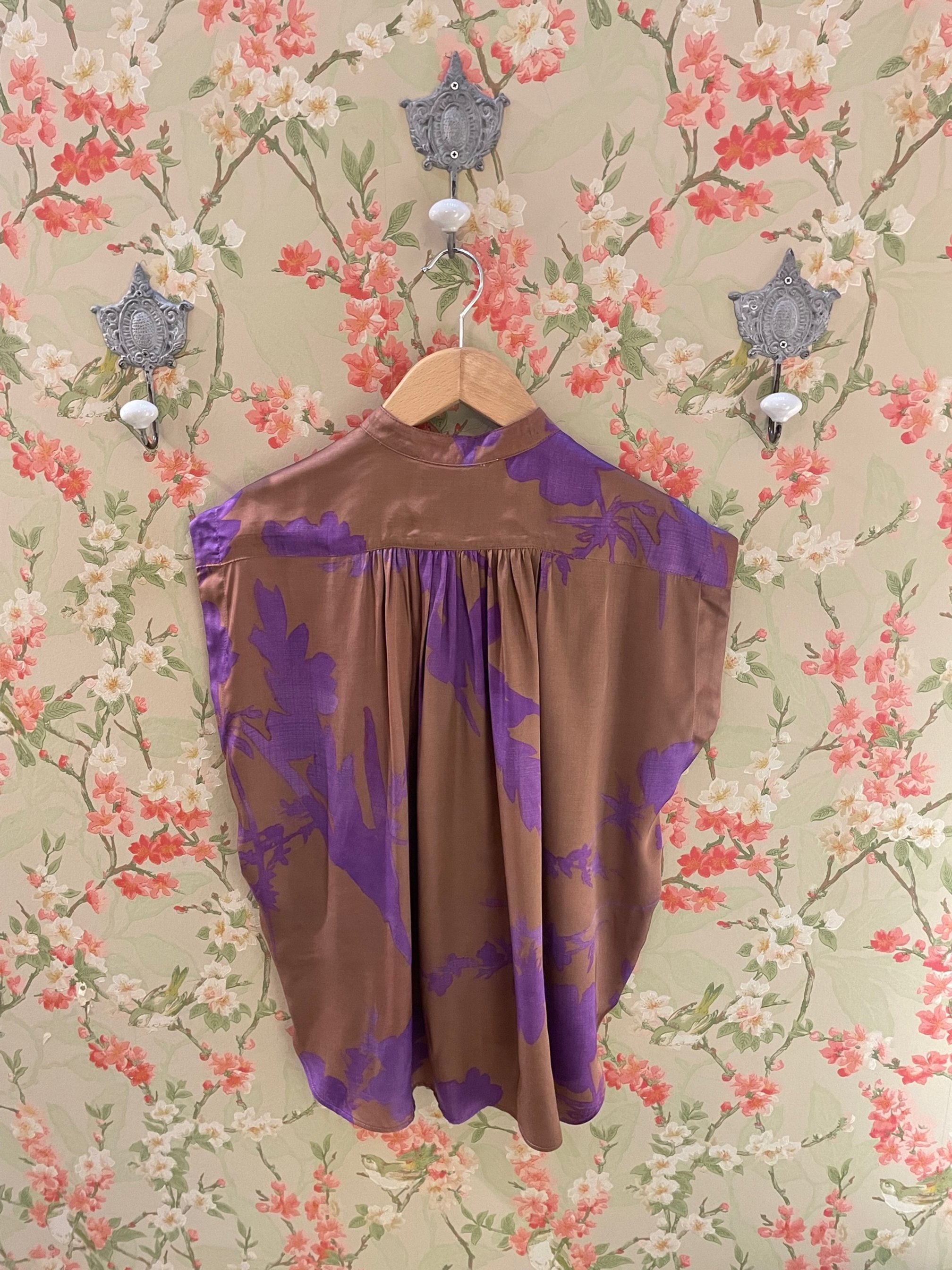 Blouse fluide à motif floral, coupe ample, sans manche, encolure arrondie boutonnée, plissé sur la ligne d’épaule, douce et élégante. Le modèle taille grand.