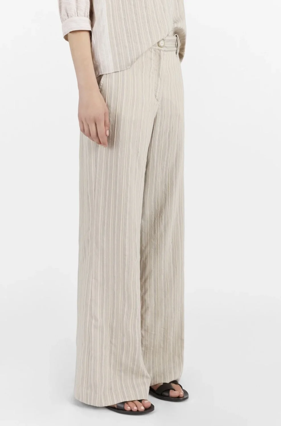 Pantalon taille haute, coupe flare, à fines rayures, poches latérales, doux et fluide. Sur la photo le modèle porte le pantalon avec la blouse Pomona Nectarine.