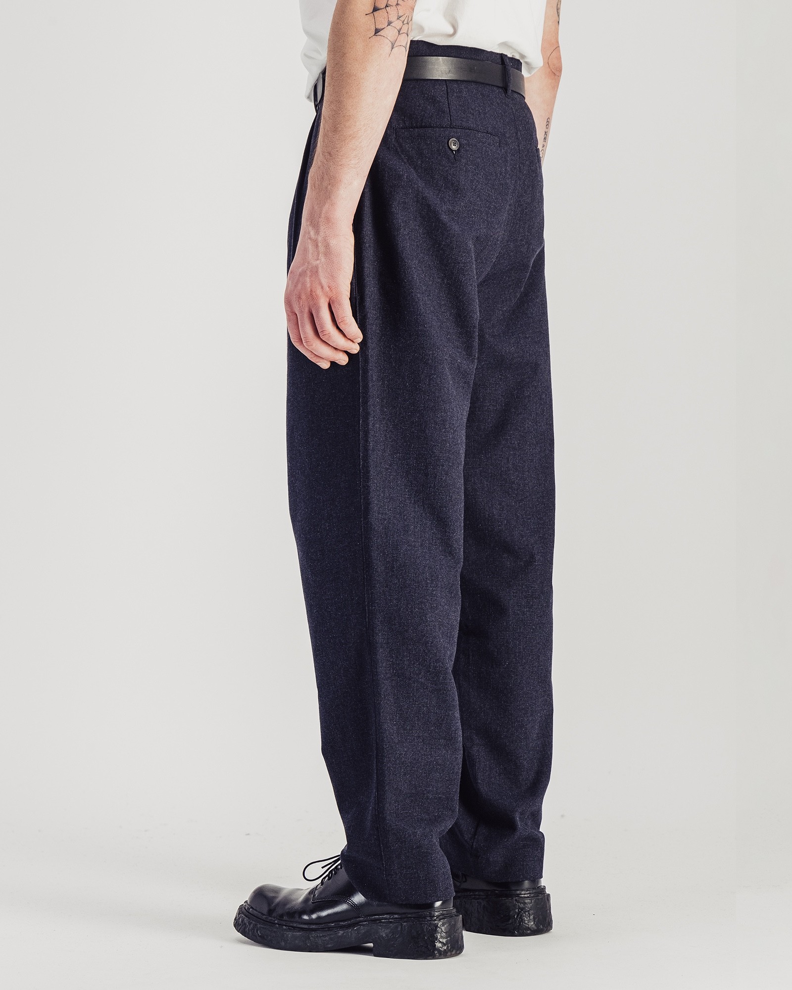 Pantalon double pince jambe large en coton et laine, bleu chiné. Poches arrières passepoilées et boutonnées. Fermeture éclair.