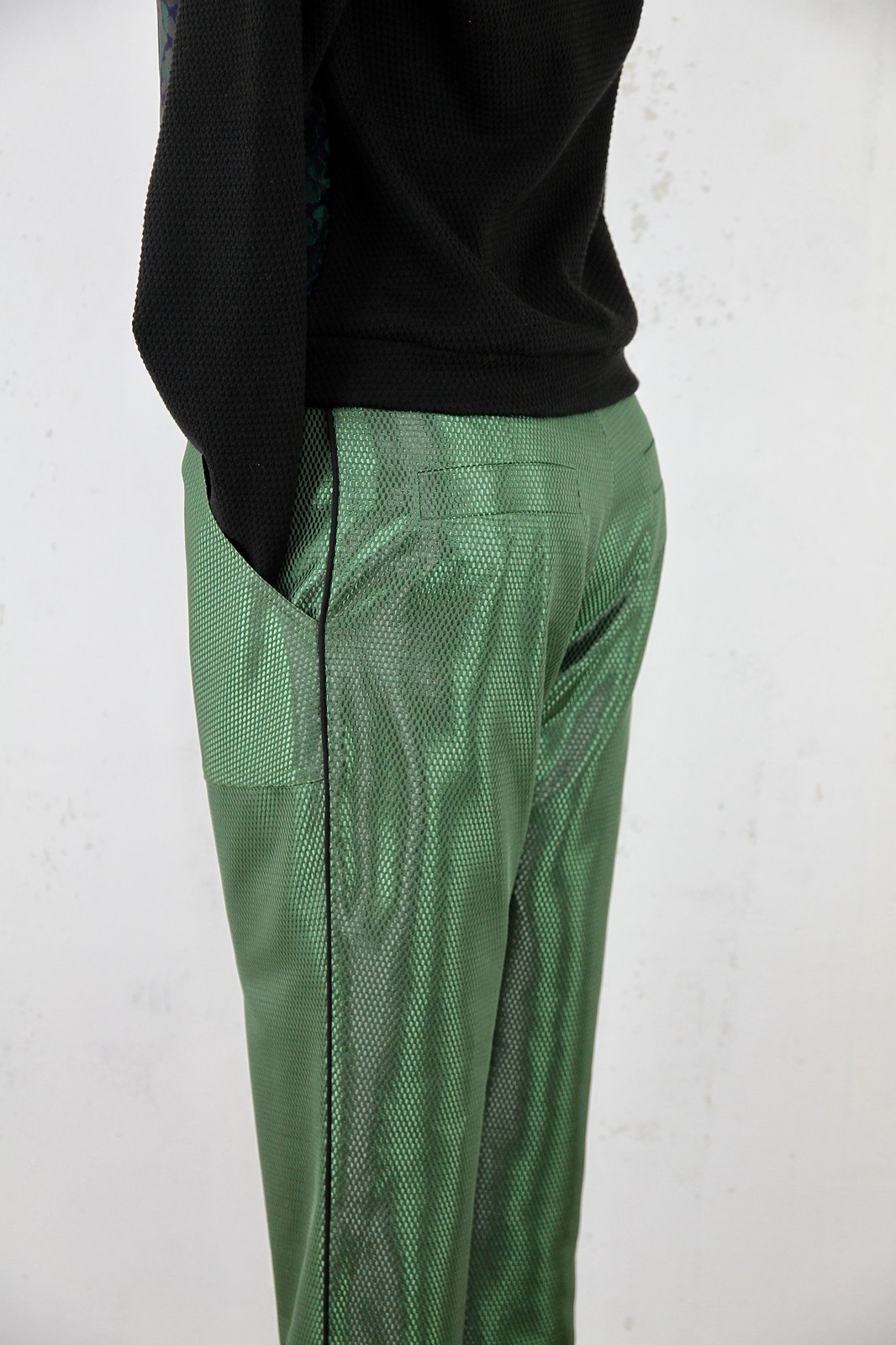 Pantalon effet à la texture plutôt irisée en viscose-polyester , doublé vert. Finitions passepoils noir. Elastique à la cheville et ouverture par un zip métallique. Prix 184€-60%=75€