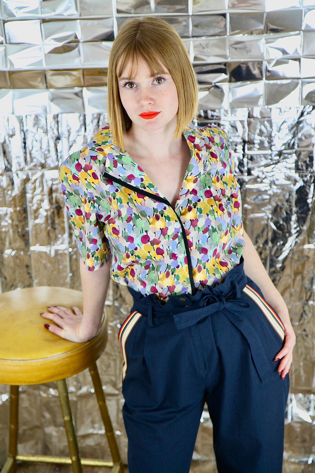 Pantalon taille haute ceinturé par une ceinture tissu ruban amovible, poches gansées de ruban. Matière coton avec une rayure dans le tissage (bonne tenue du tissu) 175€-50%: 87,50€