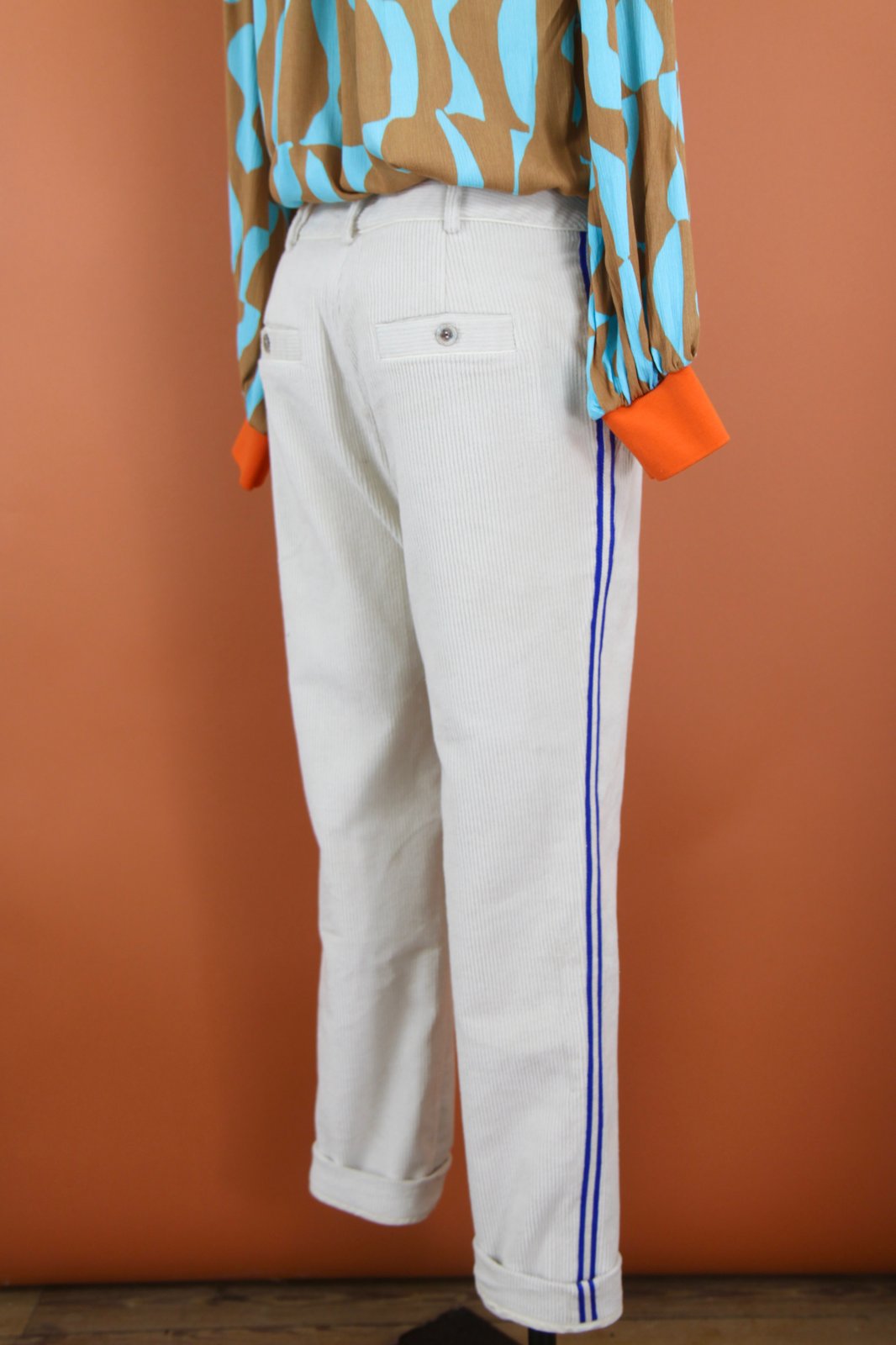 Le pantalon studio la coupe que vous connaissez est déclinée en velours cet hiver. Ganse bleu électrique sur le coté de la jambe et finitions passepoil ton sur ton. Prix 185€ -20%= 148€