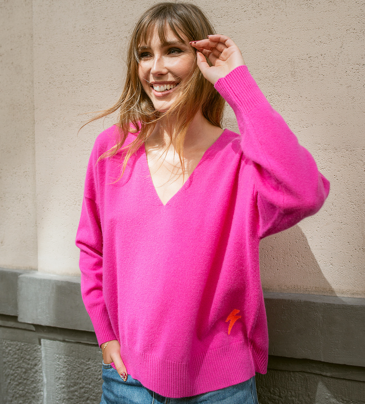 BELINDA :Pull col V, manches longues, avec unjoli éclair coloréen intarsia (tricotage haute précision).Pièce édition limitée, disponible uniquement chez MADLUV.Composition :70% laine / 30% cachemire- Taille Unique – Coloris : Rose – Existe aussi en Bleu et en Noir.La livraison est offerte pour la France Métropolitaine !