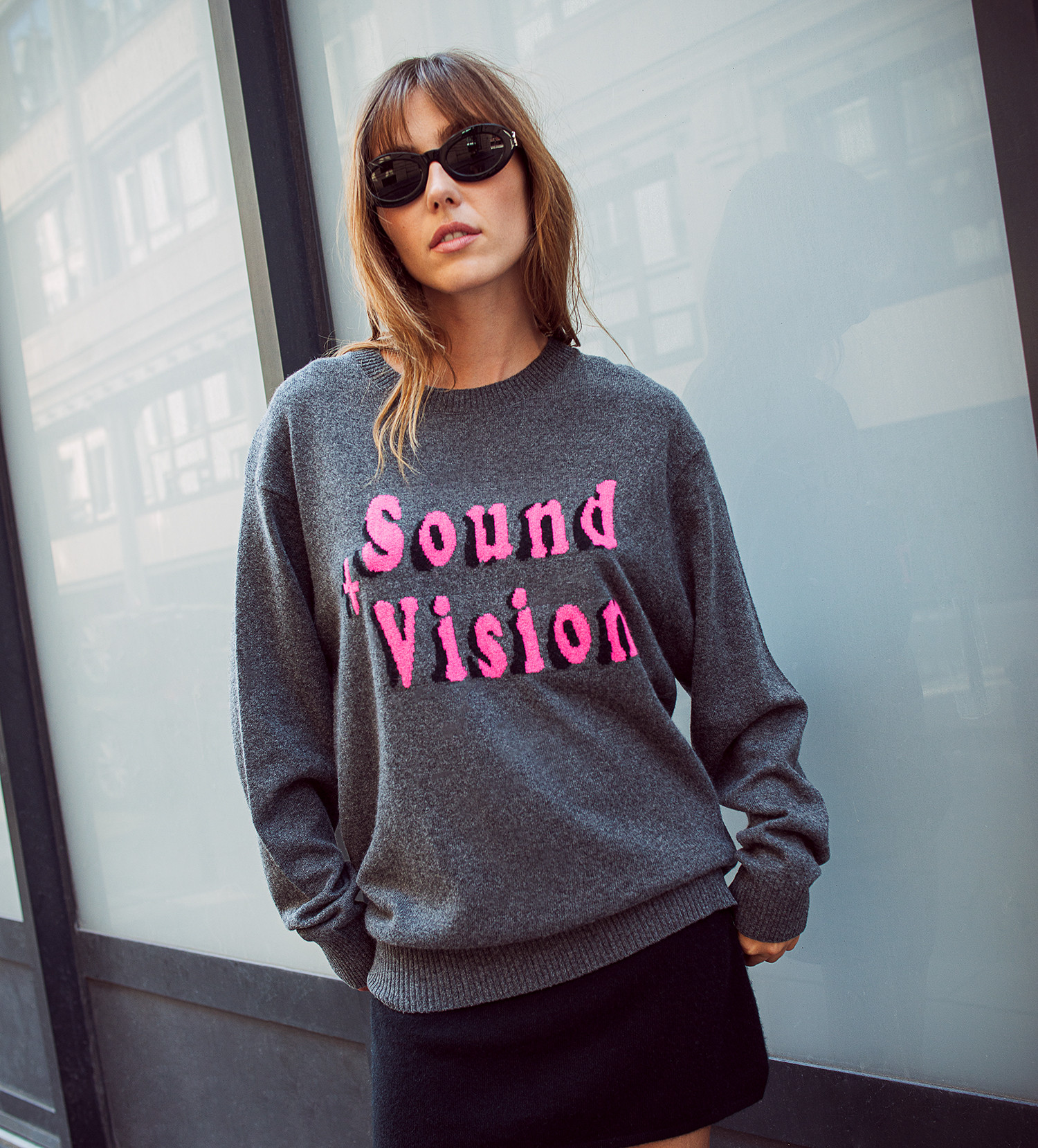 SOUND + VISION :Pull col rond – 2 fils en cachemire avec un texte en intarsia.Ce modèle est unisexe.100% cachemire- Taille Unique – Coloris : Gris foncé – Existe aussi en Noir.La livraison est offerte pour la France Métropolitaine !