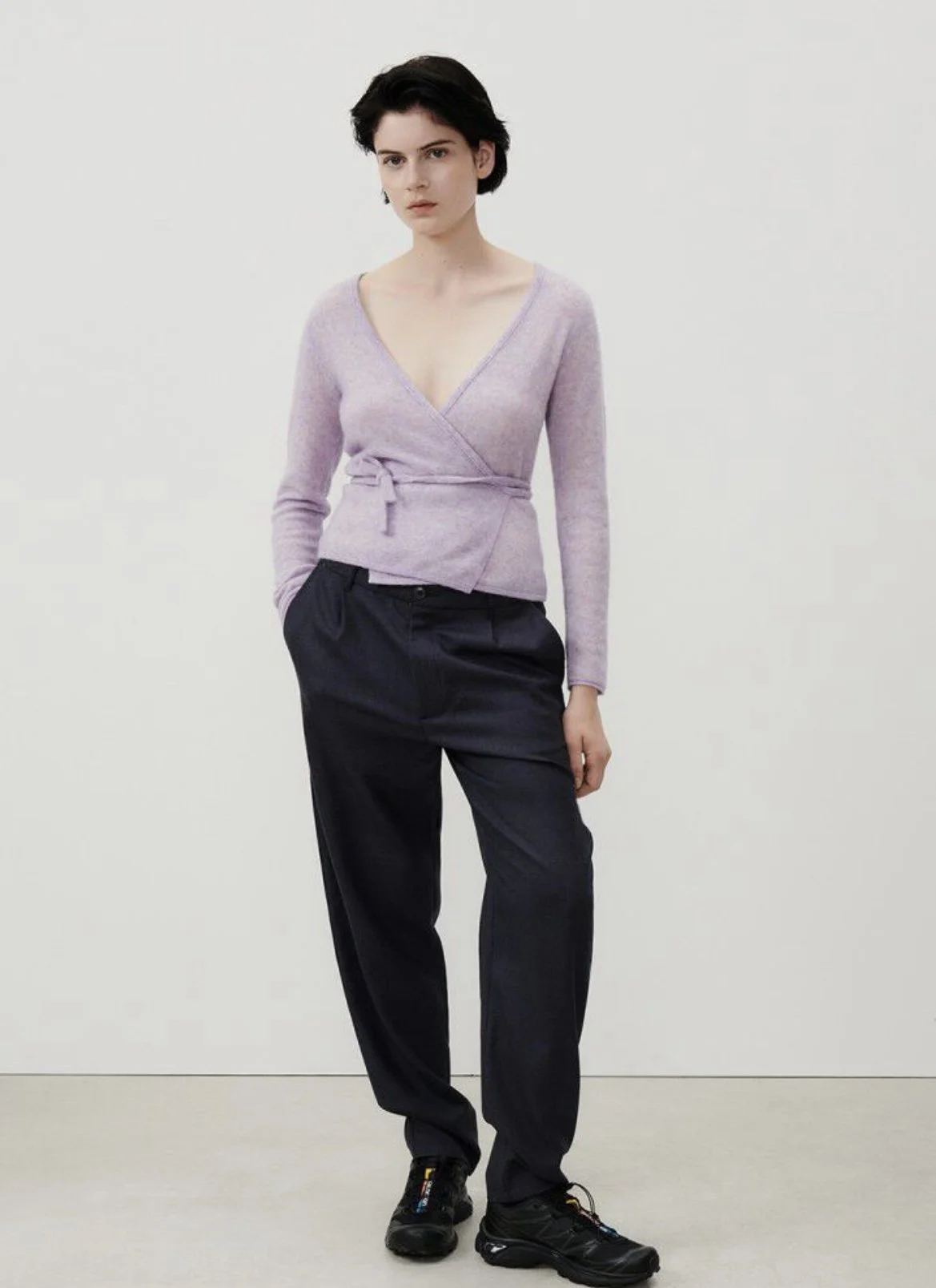 Pull cache-coeur en laine mélangée, coupe ample, manches longues, se noue sur le devant, encolure en V. Tout doux et chaud. Également disponible dans la couleur Pearl.