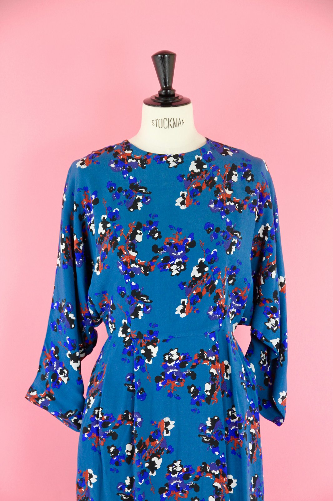 Encolure ronde, sur la photo (prototype) elle est assez proche du cou: en production l’encolure est plus ouverte, plutôt bateau, manches chauve-souris. Livrée avec un gros grain pour souligner la taille.