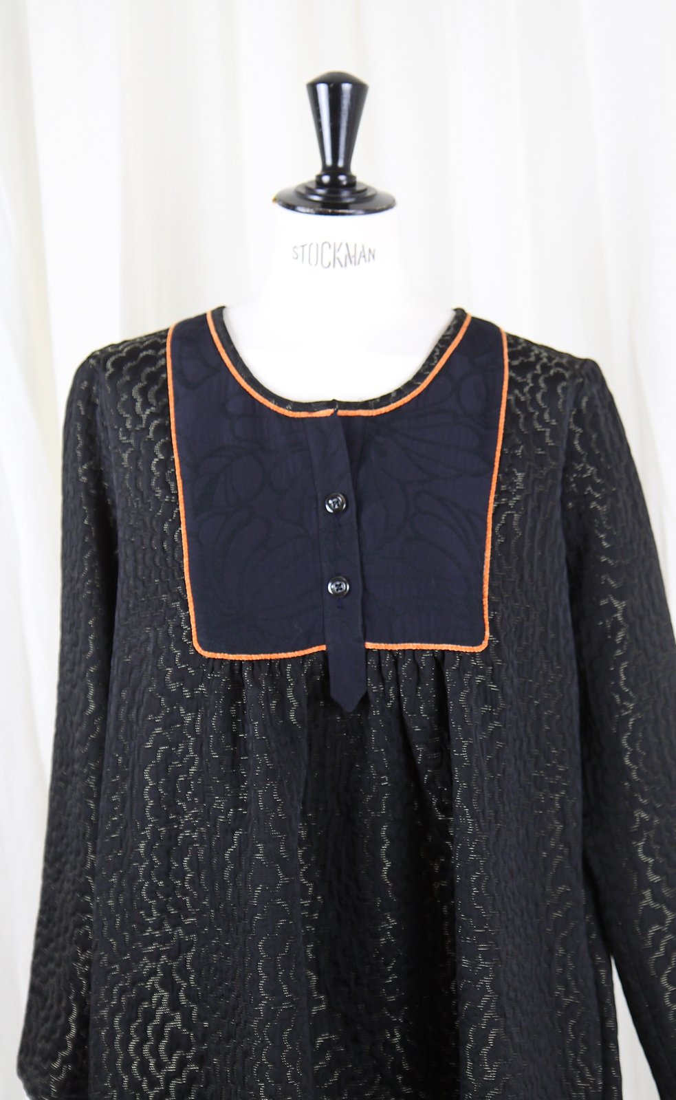 Robe coupe large, longueur genoux. Motif nuages tissés de fil doré. Plastron en tissu contrasté souligné de passepoil orange. Poches sur les cotés. Taille plutôt grand prendre la taille en dessous si vous hésitez entre deux. 260€ -40% 150€
