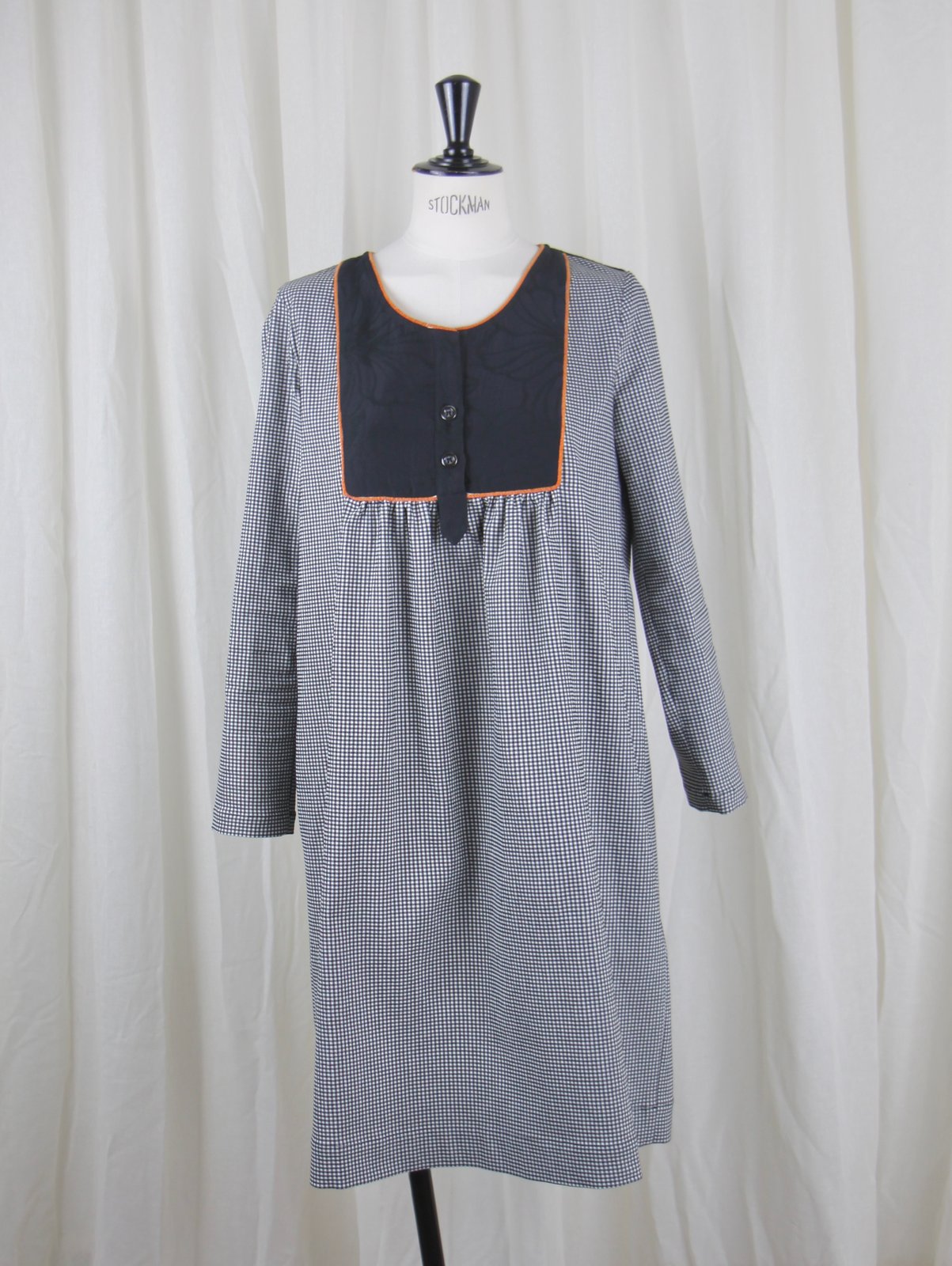 Robe coupe large, longueur genoux. Motif pied de poule. Plastron en tissu contrasté souligné de passepoil orange. Poches sur les cotés. Taille plutôt grand prendre la taille en dessous si vous hésitez entre deux. 260€ -50%: 130€