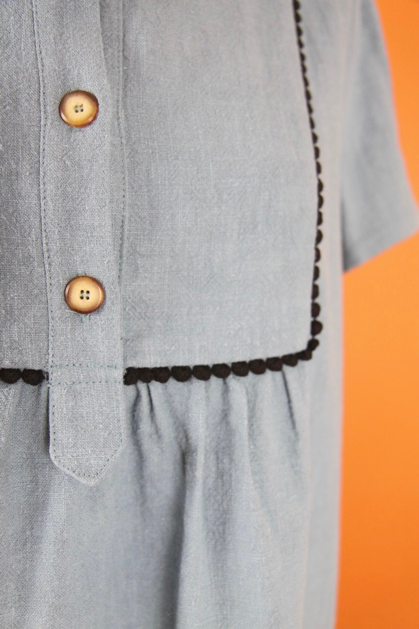 Robe en Toile de lin gris bleu orage. Plastron devant souligné de dentelle noire. Longueur aux genoux Poches sur le côté. Prix : 218€ SOLDES-50% :109€