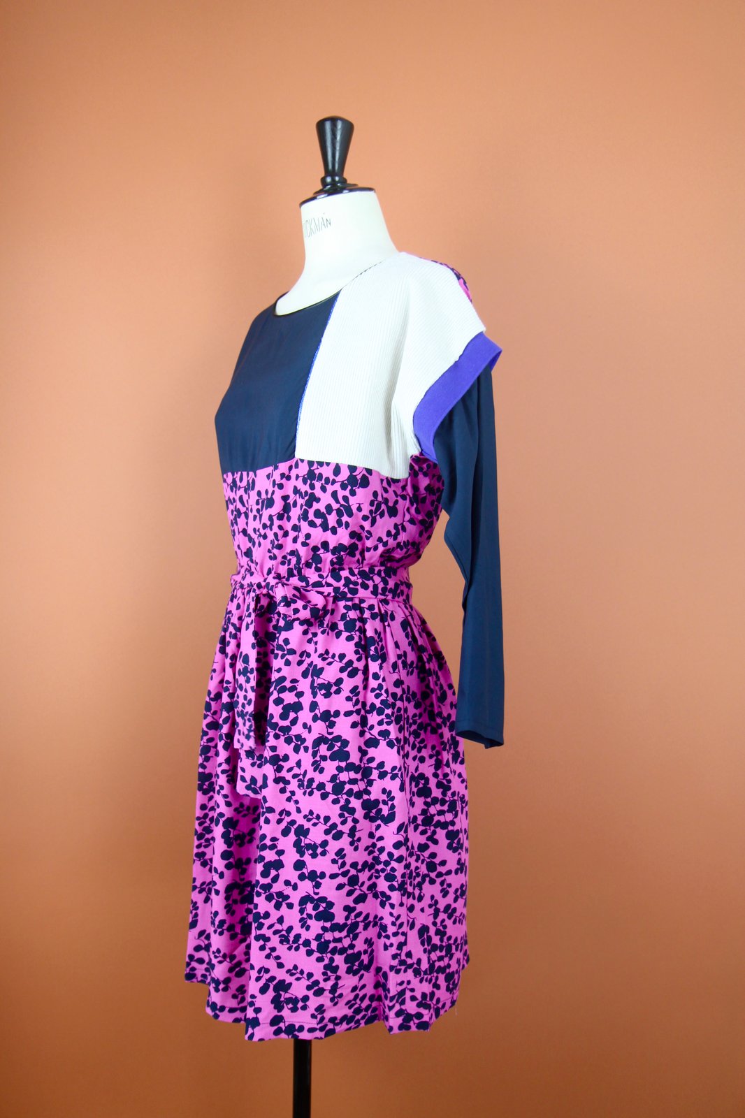 Robe en viscose imprimée effet patch avec des empiècements unis et du velours. Modèle doublé. Elastique à la taille, et ceinture à nouer. Prix: 245 € -50%= 122,50