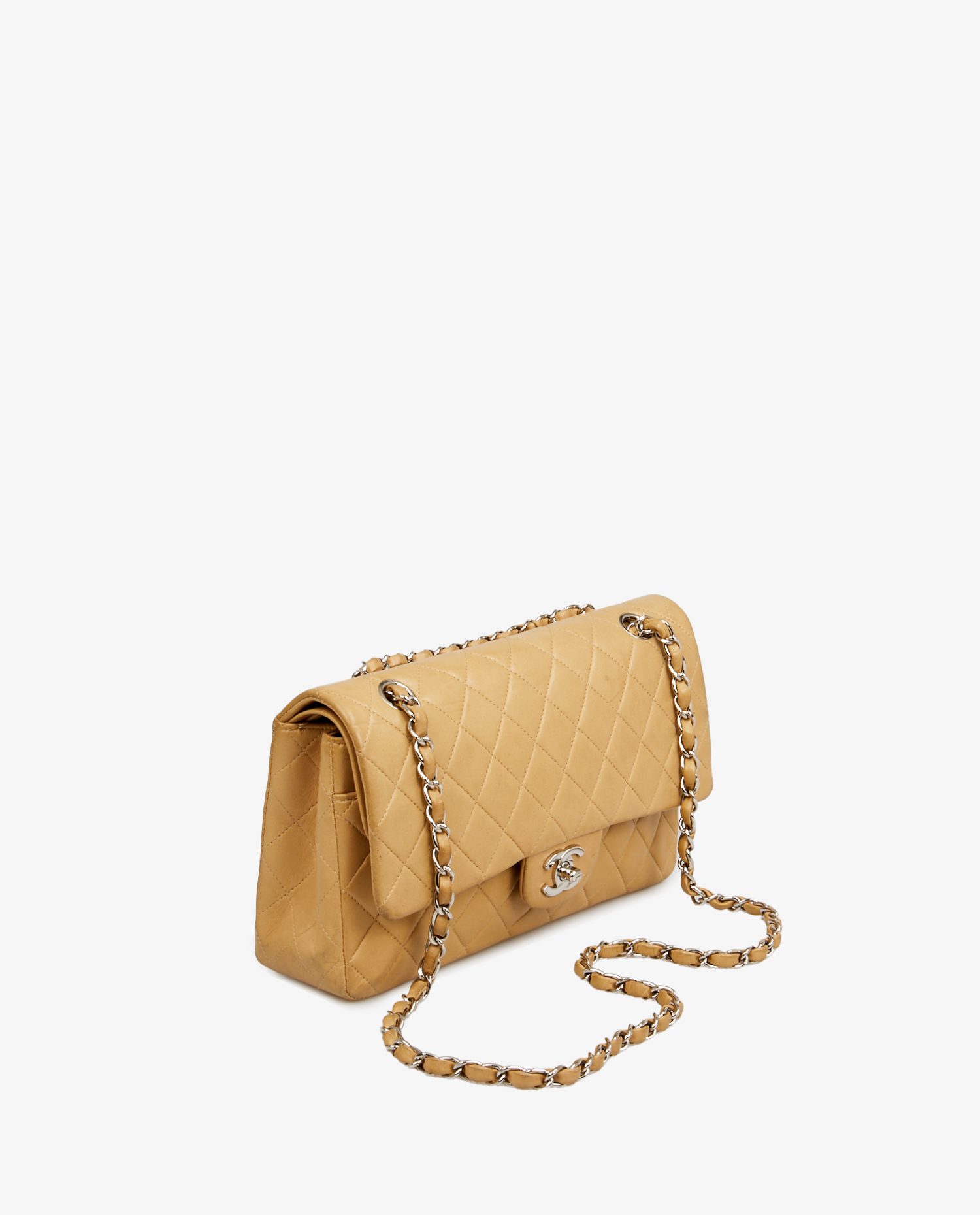 Sac Classique Chanel vintage Médium en cuir d’agneau matelassé beige. La bijouterie est argentée. Double rabat. En très bon état. Il est patiné dû à son âge. Il y a également deux marques de stylos à l’intérieur (Voir photos). Il sera livré dans son dustbag d’origine.
