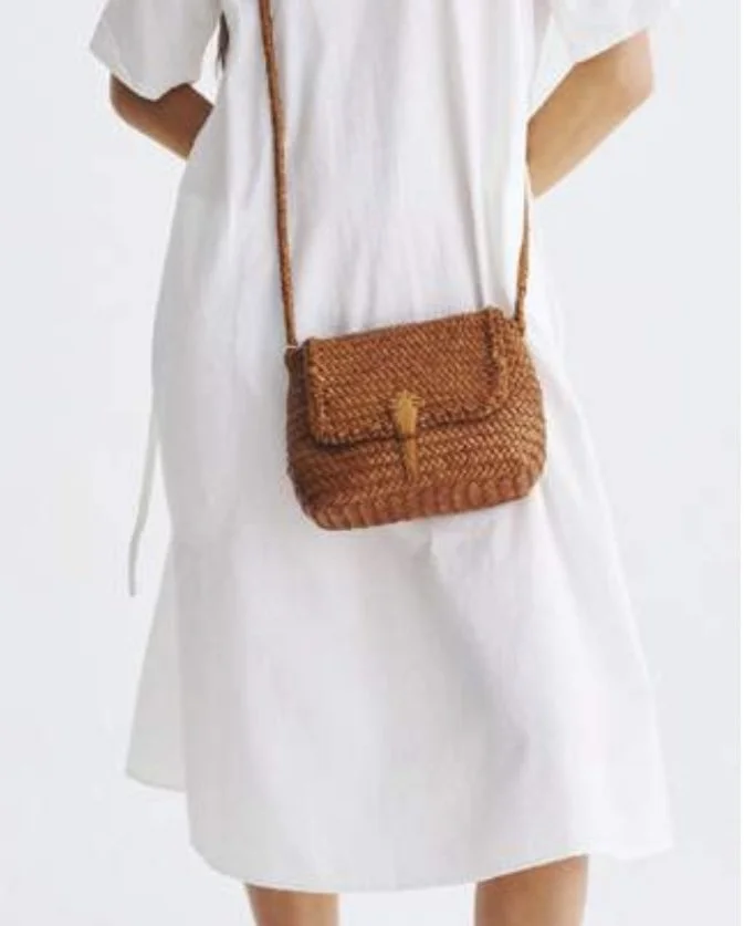 Le sac Médium City Bag de Dragon Diffusion, sac porté bandoulière ou épaule en cuir tressé, couleur Tan, entièrement réalisé à la main, une petite médaille Saint Christophe est cousue à la main à l’intérieur de chaque sac, gage d’authenticité de la marque. Ses dimensions : 33 x 24 x 10cm, si la bandoulière est trop longue il suffit de faire un noeud, le rabat se referme par une languette.