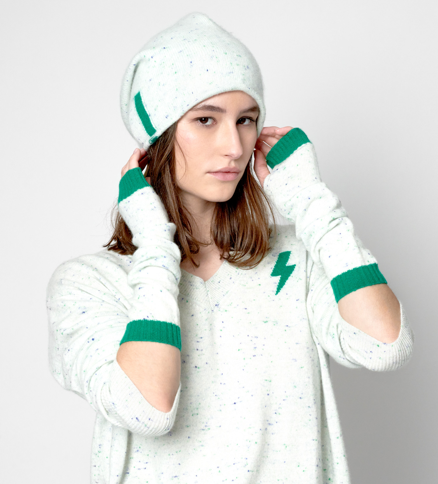 SAVANNAH :Mitaines Bicolores – Longueur : 33 cm – Taille Unique100% cachemire – Coloris : Blanc Chiné / Vert