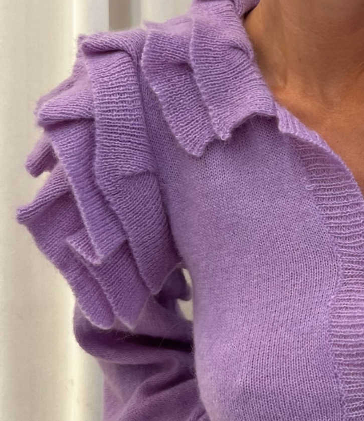 Entièrement tricoté à la main, le cardigan HELENE possède des épaules basses conférant à la pièce une coupe oversized contrebalancée par la présence de larges RIB côtelés. Son encolure ronde est  ornementée d’une ribambelle de volants harmonisant la pièce. Stella Pardo équilibre la coupe avec une délicate boutonnière en maille et une jauge fine.