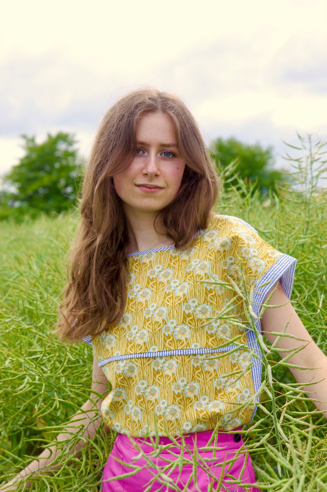 Tee shirt en coton bi matière : Devant coton imprimé dessin art déco floral. Dos et finition en seersucker (rayé bleu et blanc) 135 € -50%= 67,50€