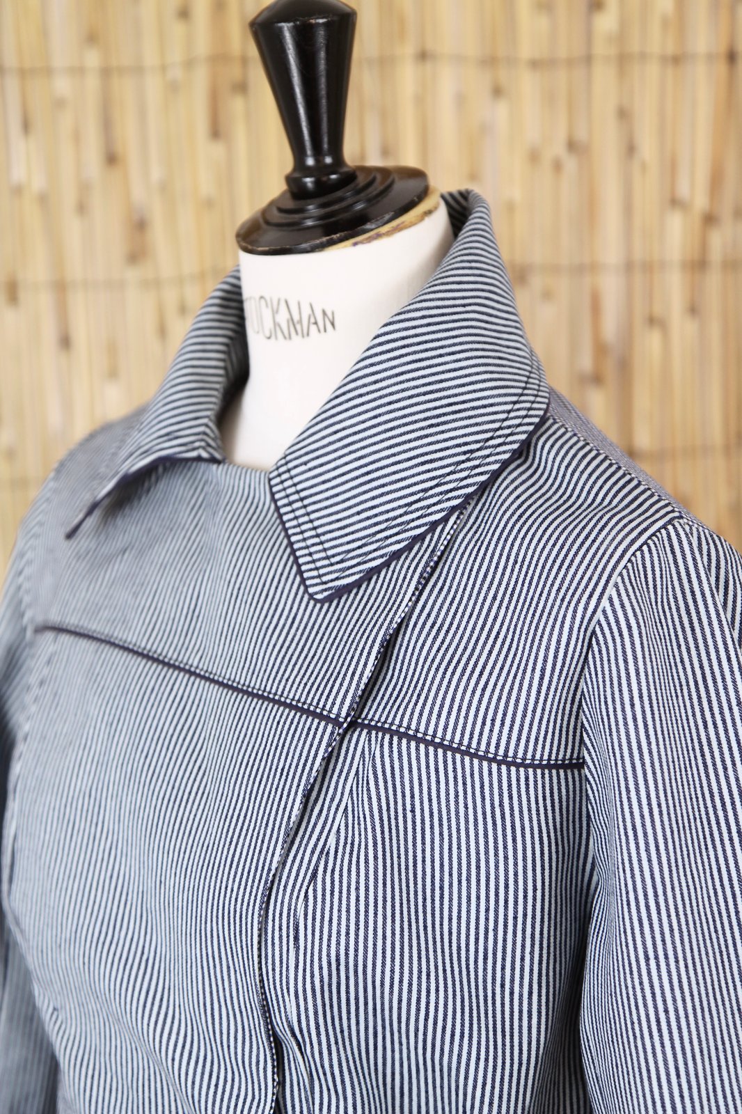 Trench en toile coton assez rigide et beaucoup de maintient. Tissus contrasté pour les détails du col, ceinture, dos. Doublé de voile de coton. 295-40%= 177