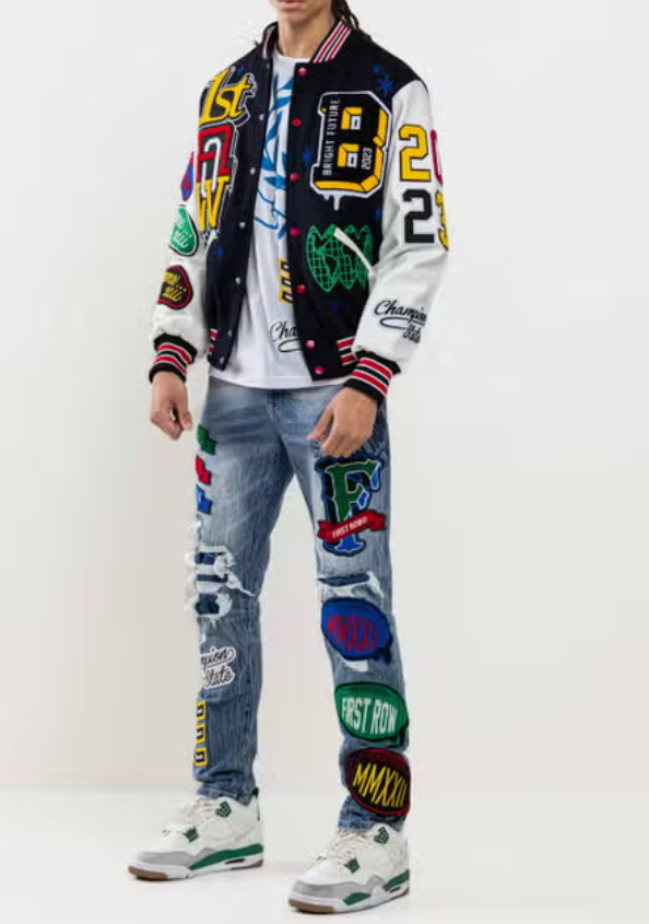 Veste universitaire oversize classique des années 90 à coupe rétro avec manches contrastantes et bordures côtelées à rayures. Il est doté de patchs en chenille multiples au design exclusif avec points de chaîne, d’un tissu en laine melton et de manches contrastantes en similicuir, de doubles poches passepoilées sur le devant et d’une fermeture à bouton-pression.