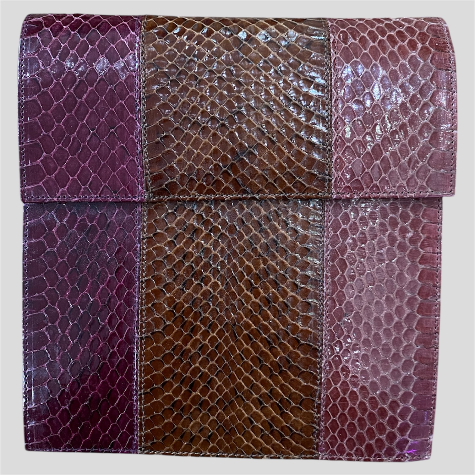 Yves Saint Laurent clutch bag in pink and purple brown snake. The interior is in purple lambskin. Magnetic button closure. The bag’s strap is embellished with pink pearls and two pompoms.