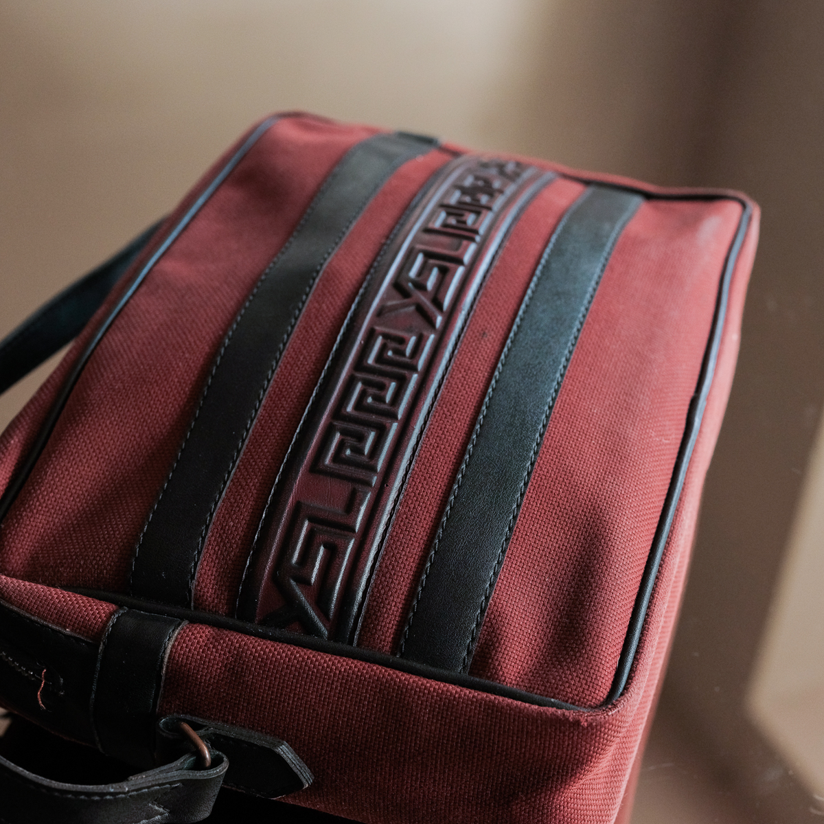 Yves Saint Laurent vintage burgundy canvas and leather shoulder bag from 70’s inside one zip pocket.