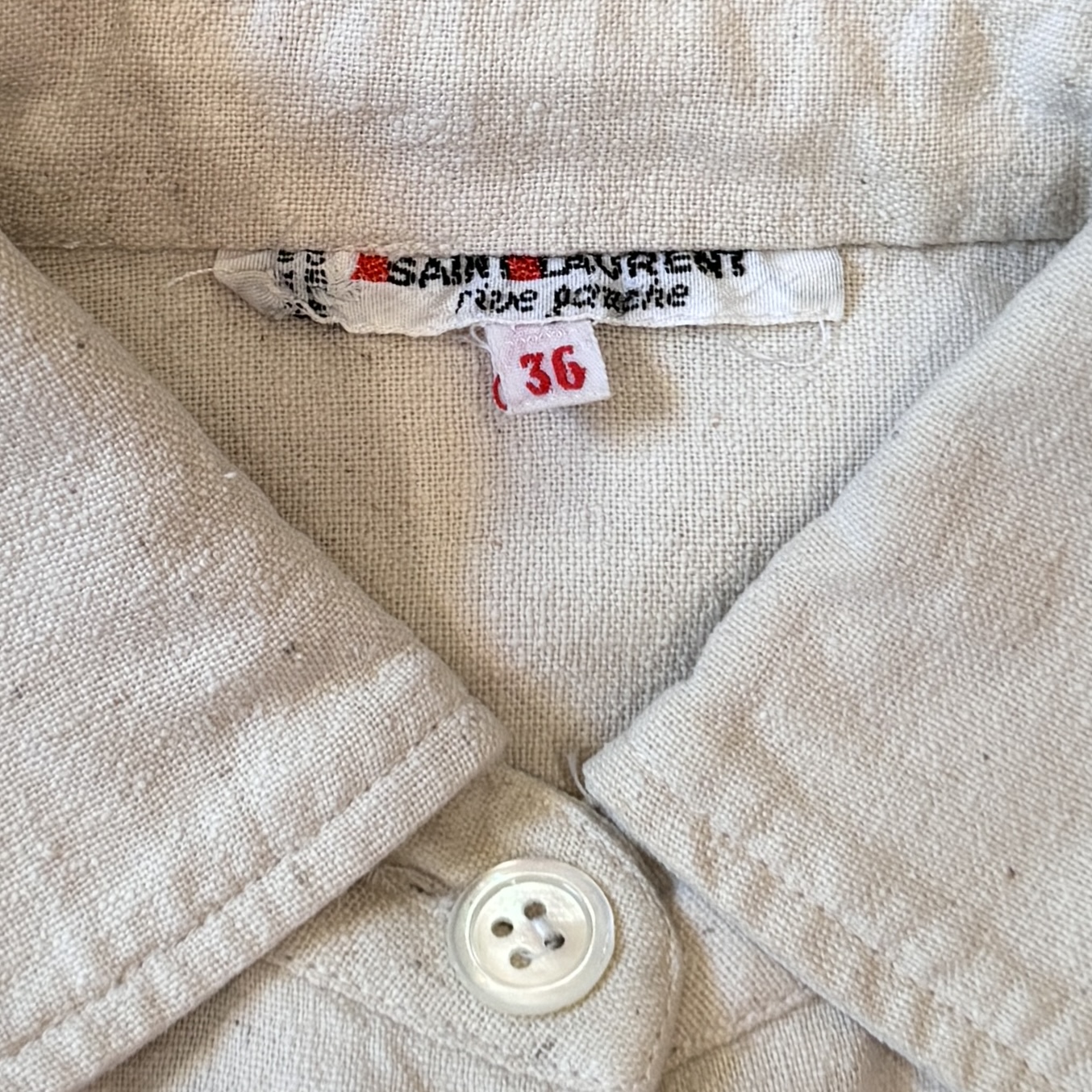 Yves Saint Laurent Raw Silk Shirt in white. It has one pocket on the front. The bottom of the sleeves is slightly open and can be closed with a button.